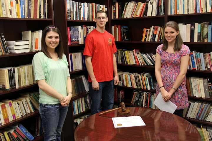 The Delta-Psi Chapter of Phi Alpha Theta History Honor Society held a special induction ceremony for new member Cory Cronin on April 18, 2012. Chapter Vice President Savannah German led Cory through the membership oath, and Delta-Psi President Caitlin Roach presented him with his certificate of membership. Faculty advisor Dr. Stephen Carls joined Caitlin and Savannah in congratulating Cory at the end of the event.