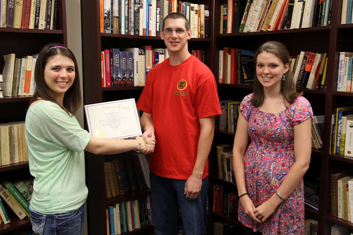 Delta-Psi Chapter President Caitlin Roach (left) presents new Phi Alpha Theta member Cory Cronin with his certificate of membership on April 18, 2012. Chapter Vice President Savannah German is on the right.