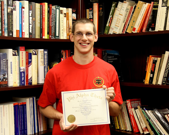 New Phi Alpha Theta member Cory Cronin proudly holds his membership certificate following his induction into the national history honor society on April 18, 2012.