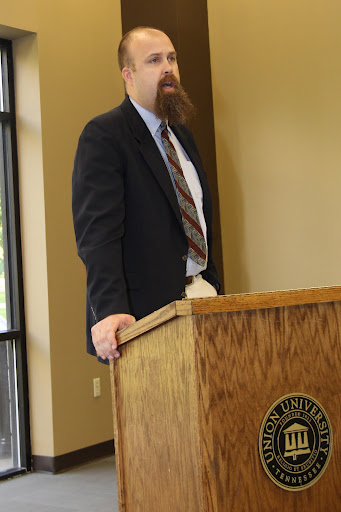 Dr. Micah Watson of Union's political science department talks about the Civil War experiences of his great-great-grandfather as the featured speaker at the Department of History Awards Banquet on May 3, 2012.