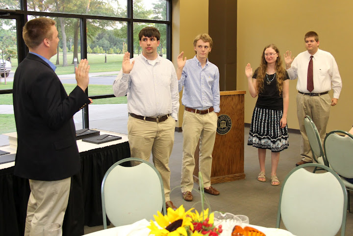 Rutledge Honorary History Club President David Conway (left) leads the incoming officers in their oath of office at the history award banquet on May 3, 2012. Those taking the oath are (left to right) Charles Snow, Aubrey Binkley, Patricia Dawson, and Will Miller.
