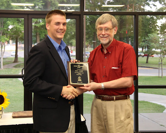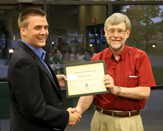 Dr. Terry Lindley (right) presents a certificate of appreciation to David Conway at the Department of History Awards Banquet on May 3 for his work as president of the Rutledge Honorary History Club in 2011-2012.