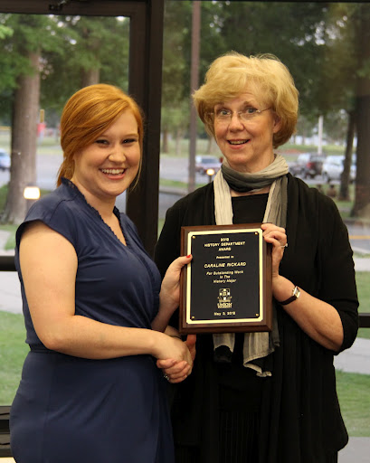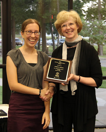 Caraline Rickard (left) accepts a History Major Award from Dr. Judy LeForge at the Department of History Awards Banquet on May 3, 2012.