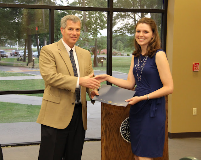 Elaura Highfield accepts a third place award from Dr. David Thomas in the Dr. James Alex Baggett History Research Paper Competition at the Department of History Awards Banquet on May 3, 2012.