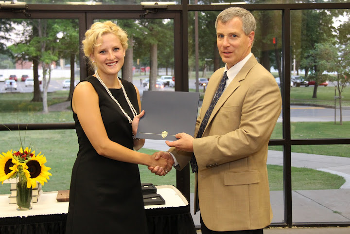 Dr. Stephen Carls presents a certificate of appreciation to Caitlin Roach at the history award banquet on May 3 for her work as president of the Delta-Psi Chapter of Phi Alpha Theta in 2011-2012.