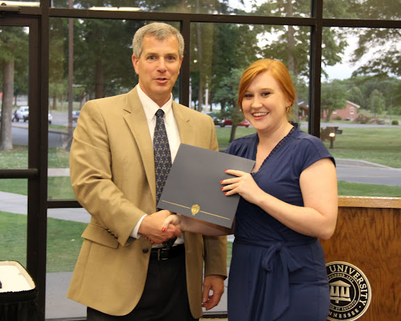 Caitlin Roach accepts a certificate of recognition and a book from Dr. Keith Bates at the history awards banquet on May 3 for her paper presentation at the Tennessee Phi Alpha Theta Regional Conference on March 24, 2012.