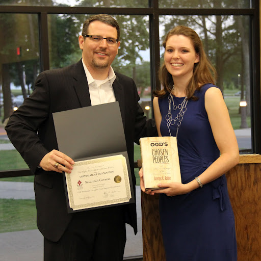 Dr. Keith Bates presents a certificate of recognition and a book to Savannah German at the history awards banquet on May 3 for her paper presentation at the Tennessee Phi Alpha Theta Regional Conference on March 24, 2012.