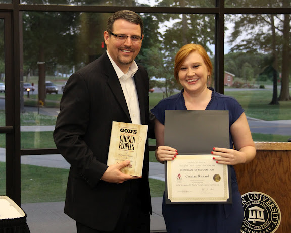 Caraline Rickard accepts a certificate of recognition and a book from Dr. Keith Bates at the history awards banquet on May 3 for her paper presentation at the Tennessee Phi Alpha Theta Regional Conference on March 24, 2012.