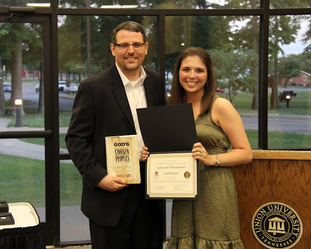 In terms of student recognitions, Caitlin Roach received the Phi Alpha Theta Scholarship Pin and Academic Achievement Award. David Conway, Elaura Highfield, and Caraline Rickard were winners of the History Major Award, while Hannah Marsh was given the History Minor Award. The department announced the second and third place winners in the Dr. James Alex Baggett History Research Papers competition; Caraline Rickard won second place while Savannah German, Elaura Highfield, and Kaleb Noblett tied for third place. The first place prize in the history research competition was scheduled for Union’s Awards Convocation on May 4. The department gave certificates of recognition and copies of George C. Rable’s God’s Almost Chosen Peoples: A Religious History of the American Civil War to Savannah German, Caraline Rickard, and Caitlin Roach for their excellent paper presentations at the Tennessee Phi Alpha Theta Regional Conference at Tennessee State University on March 24. Dr. Stephen Carls gave certificates of appreciation to Phi Alpha Theta President Caitlin Roach and Vice President Savannah German for their dedicated service to the society during the 2011-2012 school year. Dr. Terry Lindley, who was chief coordinator of the banquet, presented a certificate of appreciation to David Conway for his work as president of the Rutledge Honorary History Club in 2011-2012.