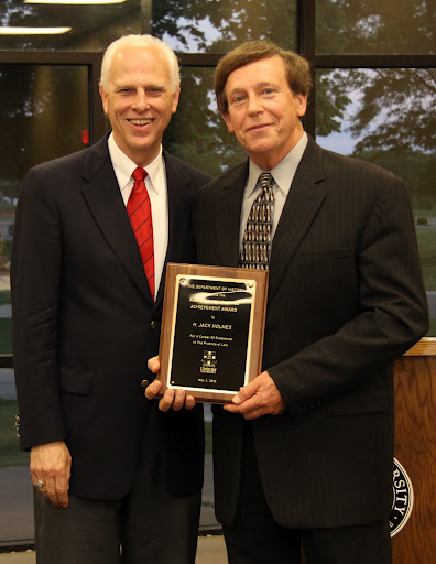 Mr. H. Jack Holmes (right) accepts the History Alumni Distinguished Achievement Award from Dr. Stephen Carls at the Department of History Awards Banquet on May 3, 2012.