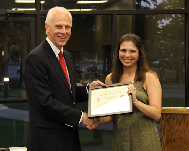 Caitlin Roach receives the Phi Alpha Theta Scholarship Pin and Academic Excellence Award from Dr. Stephen Carls at the history department awards banquet on May 3, 2012.