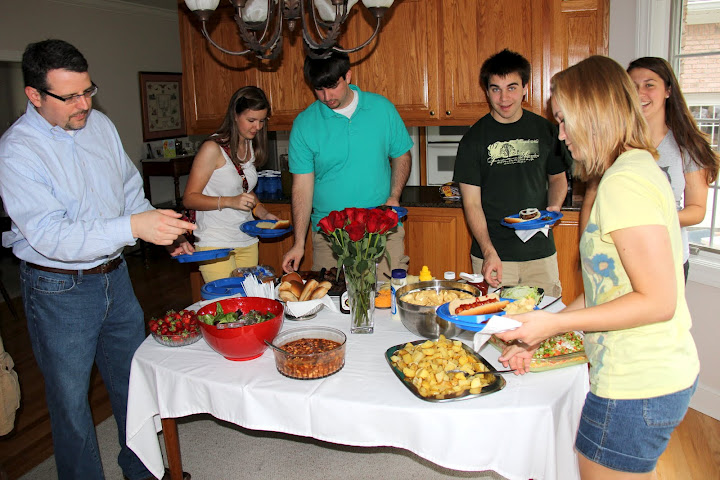 Attendees at the Phi Alpha Theta/History Department Cookout of May 11, 2012, fill their plates with food to start the evening's activities. They are (starting on the left and going clockwise) Dr. Keith Bates, Bree McCuin, Charles Snow, Kenan Keller, Emily Georgoulis, and Allie Durham.