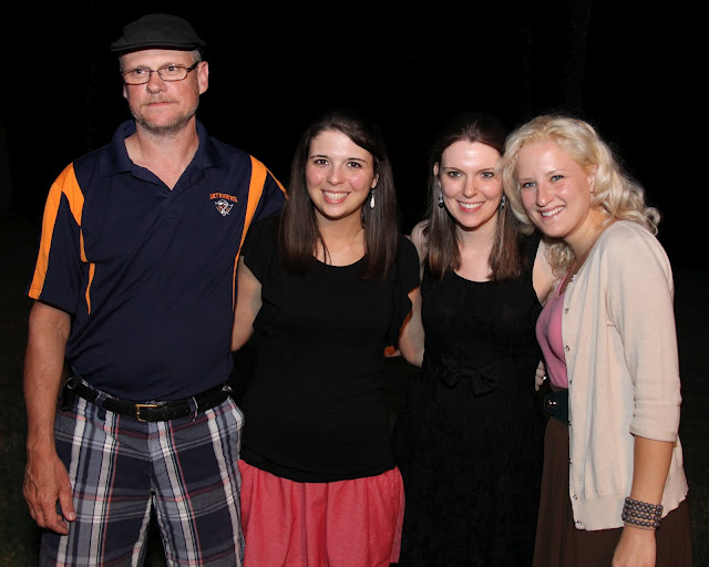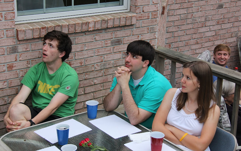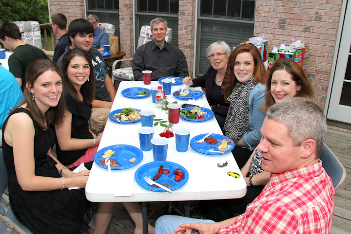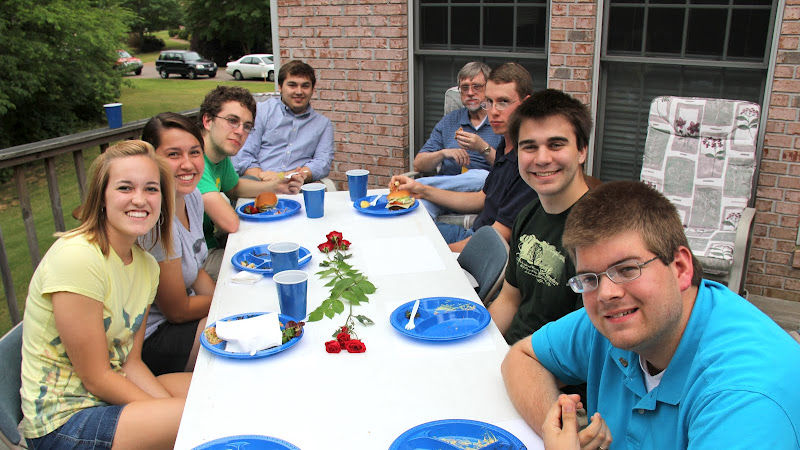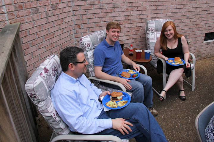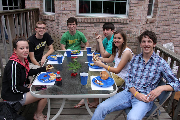 Dr. Keith Bates (front left) enjoys a cookout meal with Union students Cody Goodman and Caraline Rickard on May 11, 2012, at Dr. Carls' home.