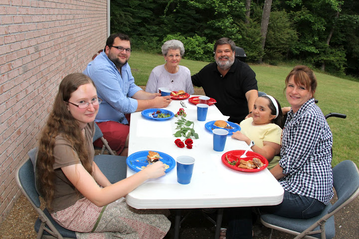 Patricia Dawson (left to right, going clockwise), Brooks Shaw, Mrs. Ann Shaw, Mr. Clark Shaw, Elizabeth Shaw, and Mrs. Juanita Shaw enjoy beautiful weather and good food together at the Phi Alpha Theta cookout on May 11, 2012.