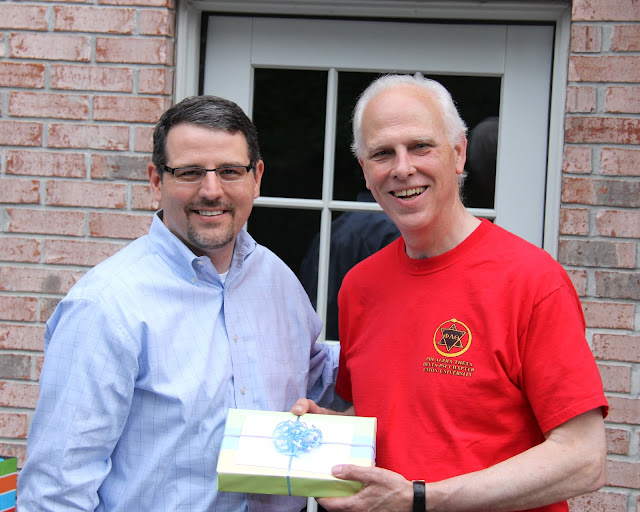 Dr. Stephen Carls (right) presents a gift from the history department to Dr. Keith Bates at the Phi Alpha Theta cookout on May 11, 2012, to celebrate his receipt of tenure at Union University.