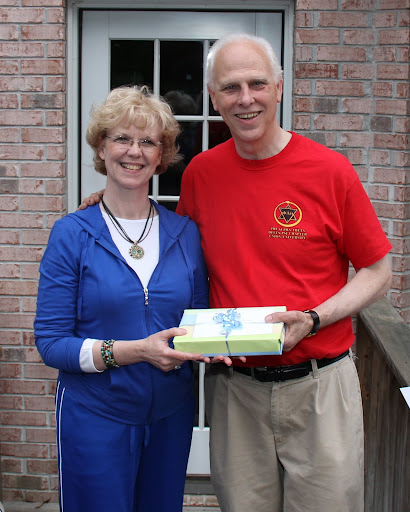 Dr. Stephen Carls presents a gift from the history department to Dr. Judy LeForge at the Phi Alpha Theta cookout on May 11, 2012, to celebrate her promotion to the rank of full professor at Union.