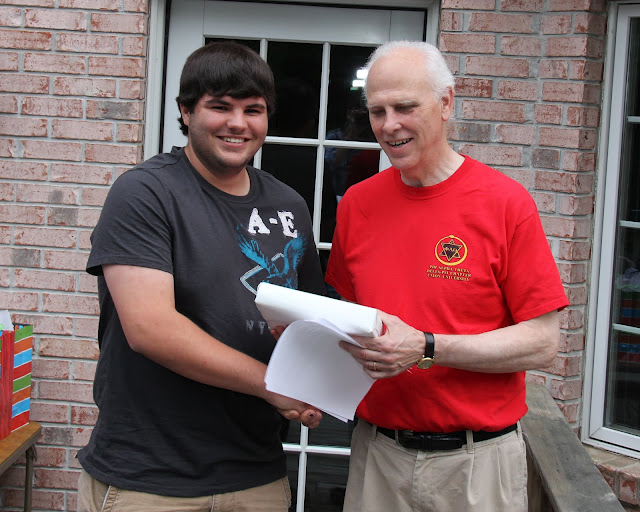Jordan Haskins receives special recognition from Dr. Stephen Carls at the Phi Alpha Theta cookout on May 11, 2012, for his service as a volunteer at Delta-Psi Chapter events throughout the year.