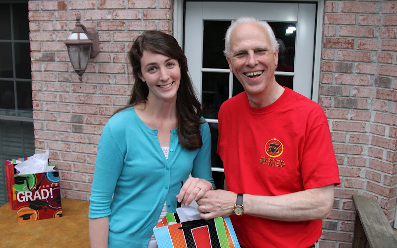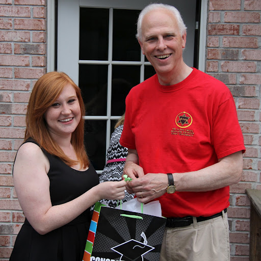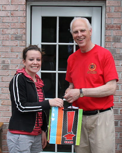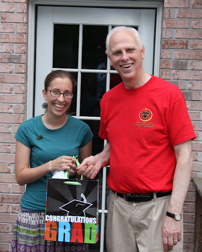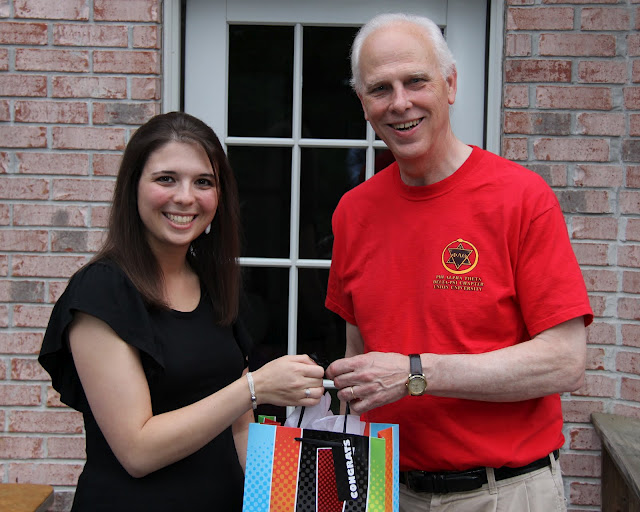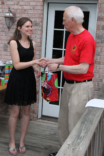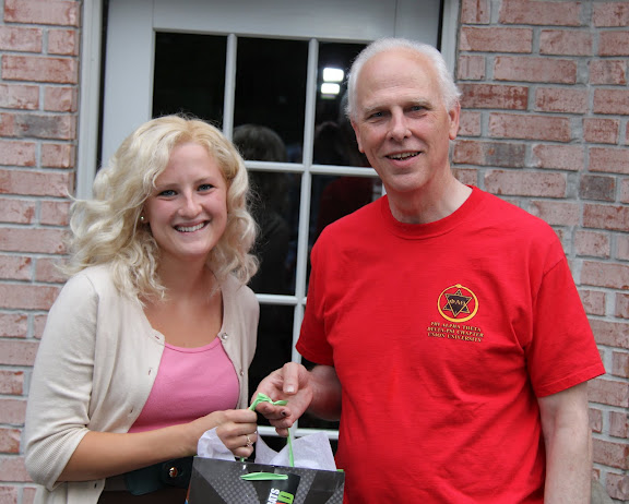 Phi Alpha Theta member Hannah Marsh accepts congratulations and a graduation gift bag from Dr. Stephen Carls at the Phi Alpha Theta/History Department Cookout on May 11, 2012.