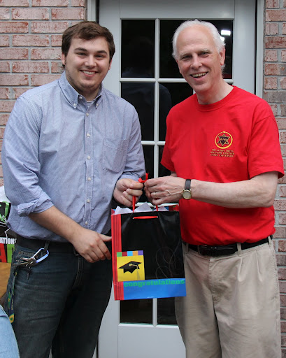 Dr. Stephen Carls gives congratulations and a graduation gift bag to Kaleb Noblett at the Phi Alpha Theta/History Department Cookout on May 11, 2012.
