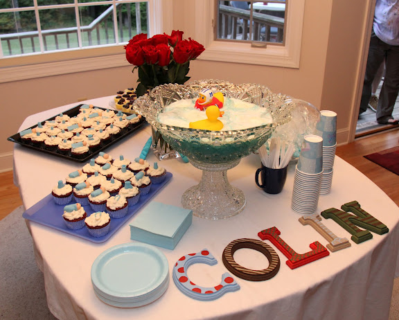 Desserts and punch are a part of the baby shower celebration for Dr. Keith and Mrs. Lisa Bates at the Phi Alpha Theta cookout on May 11, 2012. As is evident from the table, the name of their forthcoming son will be Colin.