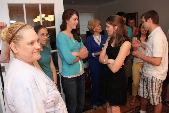 Phi Alpha Theta President Caitlin Roach (front left) and Vice President Savannah German (standing in black dress to the right) begin the surprise baby shower for Dr. and Mrs. Keith Bates by bringing from the house a playpen full of gifts for the happy couple to open on May 11, 2012. Mrs. Bates is seated just to the right of Caitlin. Also in the foreground is Rachel Thomas (seated to the right of Mrs. Bates).