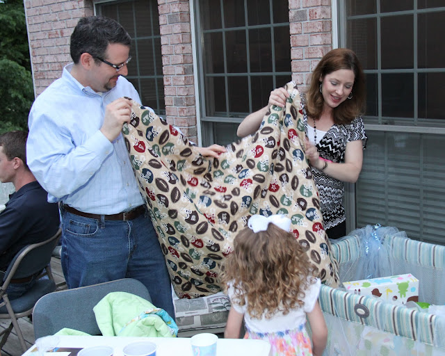 Dr. Keith Bates, his wife Lisa, and their daughter Rachel admire a homemade quilt given to them at the surprise baby shower that was a part of the Phi Alpha Theta cookout on May 11, 2012.