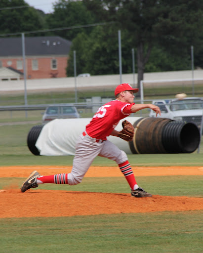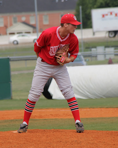 Cody Dew looks for the pitching sign from his catcher as he prepares to deliver a pitch in the TranSouth Conference tournament championship game on May 3, 2012. Cody pitched the final 2.1 innings of the game, shutting out the Blue Mountain College Toppers in the process. Union won the game 2-1.