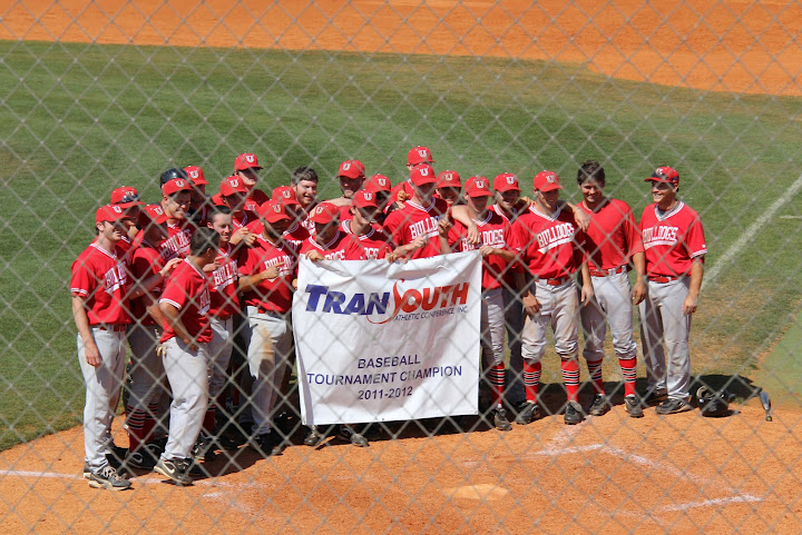 The Union University baseball team shows off its newly won TranSouth Athletic Conference Baseball Tournament Championship banner on May 3, 2012. Cody Dew is the fifth player from the right, holding a corner of the banner.