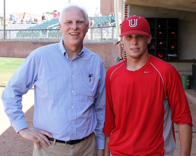 Dr. Stephen Carls stands with Union pitcher Cody Dew after Union defeated Blue Mountain College on May 3, 2012, to win the TranSouth baseball tournament championship. Cody pitched the last 2.1 innings of the game, and allowed Blue Mountain no runs in the process.