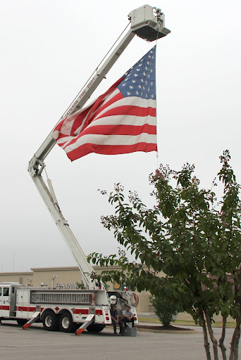 A large American flag sponsored by the Jackson Fire Department helps mark the starting area for the "Running So They Can Ride" Fund"Racing" Event on September 15, 2012.