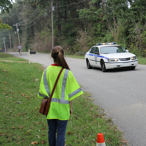 Delta-Psi Vice President and race volunteer Mary Ellen Poe watches as 5K race leader Douglas Martin comes into view behind a police escort during the "Racing So They Can Ride" races on September 15, 2012.