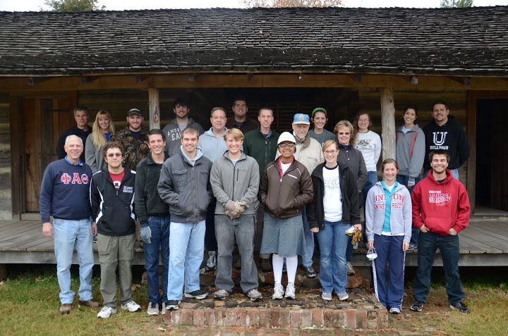 Twenty-three people, including 17 students and 6 faculty members, participated in a Phi Alpha Theta/history department-sponsored community service project at Parker’s Crossroads Civil War Battlefield Park on November 6 as a part of Union’s “Campus and Community: A Day of Remembrance and Service.” Members of the Rutledge Honorary History Club also joined in this activity. State Representative Steve McDaniel, who has been instrumental in assuring the preservation of the site, served as the host for the day. Participants divided into three work details: one group whitewashed the walls of a cabin in the park; a second group gathered up metal stakes left over from a weekend of events that marked the 150th anniversary of the battle of Parker’s Crossroads; and the third group cleaned up re-enactors’ weekend campsites and took unused firewood to a storage shed. Following a box-lunch meal, project participants joined with other workers at the battlefield site to dismantle a large pavilion tent.