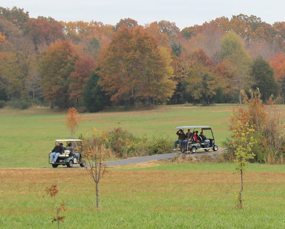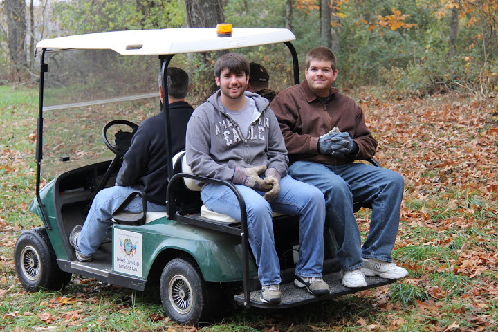 Union University participants in the community service project at Parker's Crossroads on November 6, 2012, use golf carts to travel about picking up metal stakes used the preceding weekend for activities that were a part of the 150th anniversary of the battle on December 31, 1862.