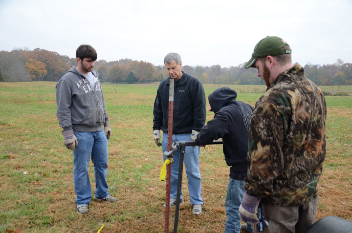 Charles Snow (left), Dr. David Thomas (second from left) and Kenton Evans (right) watch while a park worker loosens a metal stake at Parker's Crossroads on November 6, 2012. Photo by Jacob Moore