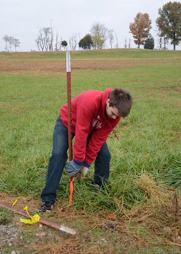 Kenan Keller pulls up a metal stake at Parker's Crossroads Civil War Battlefield Park on November 6, 2012. Photo by Jacob Moore