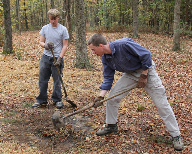 History majors Cale Little (left) and Jeffrey Lewoczko on November 6 cover the remnants of a campfire site left from a 150th anniversary reenactment weekend that took place on November 2-4 at the site of the Civil War battle of Parker's Crossroads in December, 1862.