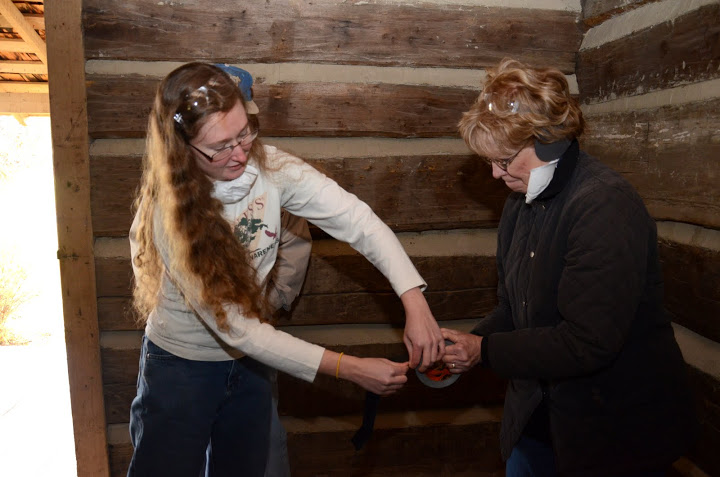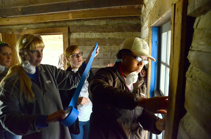 Senior history major Patricia Dawson and Dr. Judy LeForge use masking tape to help prepare a cabin interior for the application of a coat of whitewash at Parker's Crossroads on November 6, 2012. Photo by Jacob Moore