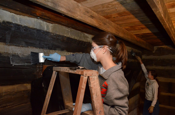 Union students Autumn Hitt (left to right) Katy Fraley, Heather Stricklin, and Glenae Nora help prepare a cabin interior for the application of a coat of whitewash on its walls at Parker's Crossroads on November 6, 2012. Photo by Jacob Moore