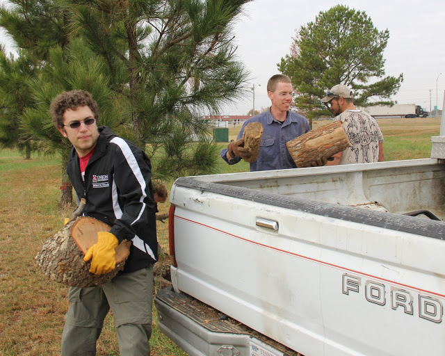 Phi Alpha Theta President Jeffrey Lewoczko (left) unloads a large piece of firewood from a truck parked in a storage building at Parker's Crossroads Civil War Battlefield Park on November 6, 2012. Charles Snow (center) and Dr. Henry Allen also help with the unloading process.