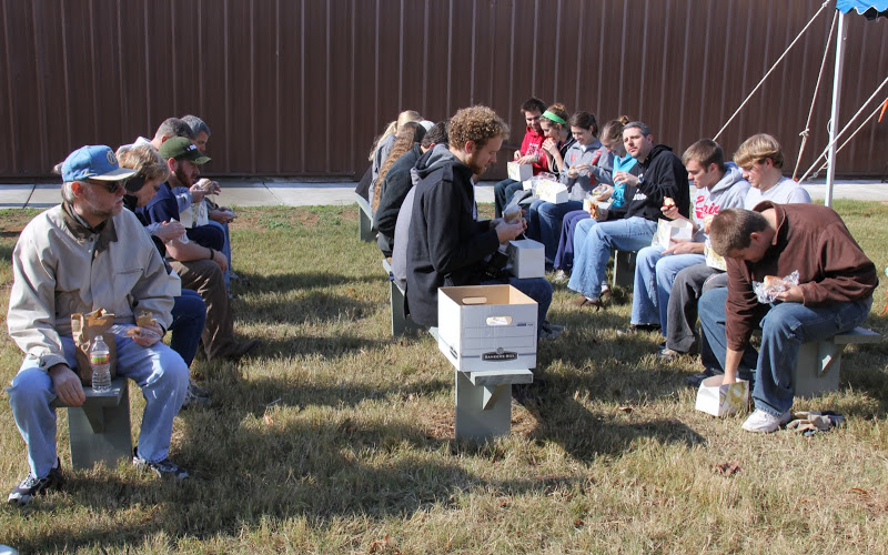 Participants in the history department's November 6 community service project at Parker's Crossroads Civil War Battlefield Park take a lunch break following a busy morning of work activities.