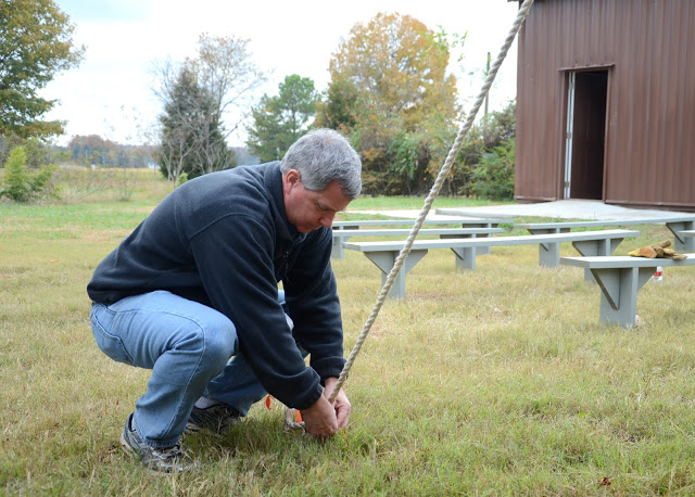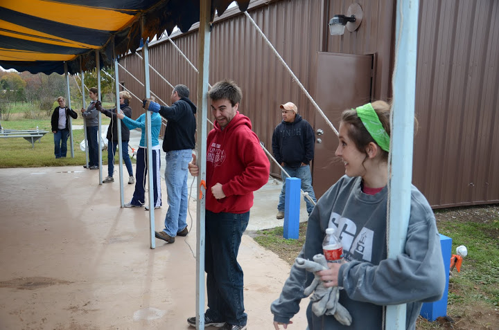 Dr. David Thomas unties a rope during the dismantlement of a pavilion tent at Parker's Crossroads on November 6, 2012. Photo by Jacob Moore