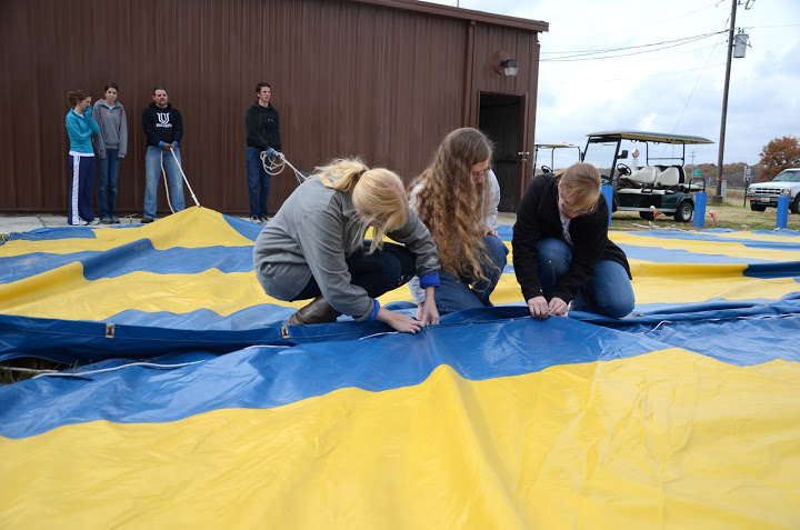 Katy Fraley (front, left to right), Patricia Dawson, and Heather Stricklin help prepare a dismantled tent at Parker's Crossroads for storage on November 6, 2012. Standing in the background are Union community service participants Mary Ellen Poe (left to right), Gracie Wise, Dr. Keith Bates, and Logan Smith. Photo by Jacob Moore