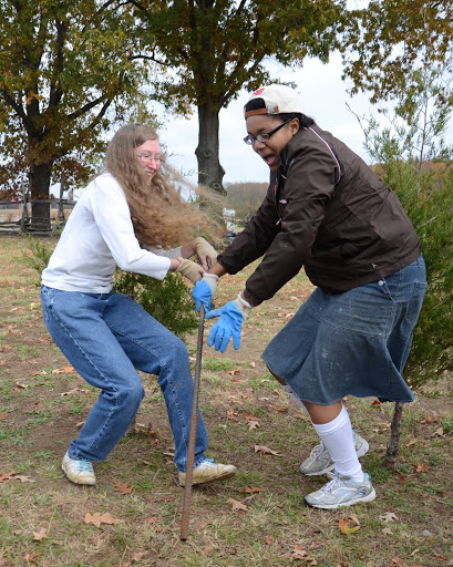 Patricia Dawson (left) and Glenae Nora celebrate their success in removing a large tent stake from the ground on November 6, 2012. Photo by Jacob Moore