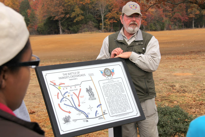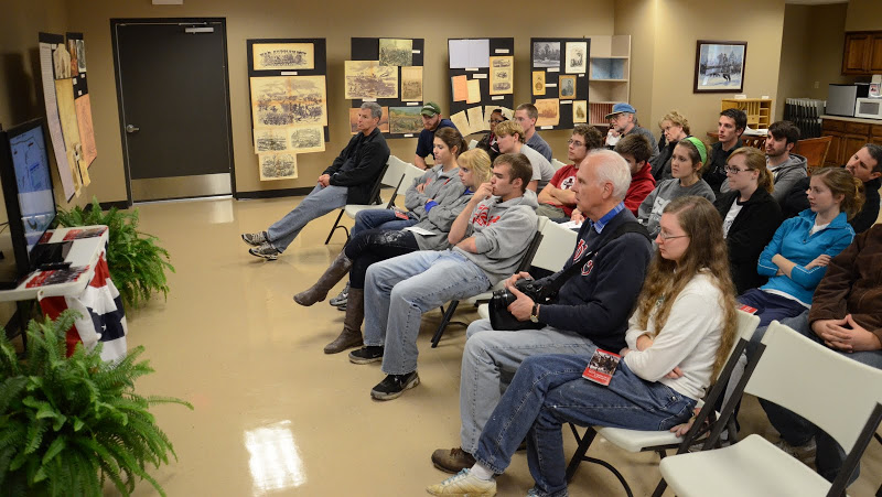 State Representative Steve McDaniel describes the initial phase of the battle of Parker's Crossroads to Union University community service participants on November 6, 2012.