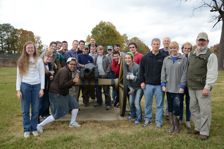 Participants in the history department community service project gather around a cannon at Parker's Crossroads Civil War Battlefield Park toward the conclusion of their day there. At the front left are Patricia Dawson (wearing white sweatshirt) and Glenae Nora (wearing brown jacket); the others are (starting on the left behind Patricia and moving right) Heather Stricklin, Gracie Wise, Mary Ellen Poe, Will Miller, Jeffrey Lewoczko, Logan Smith, Kenton Evans, Colton Gebben, Dr. Keith Bates (standing directly behind Colton), Cale Little, Dr. Terry Lindley, Charles Snow (dressed in gray sweatshirt), Kenan Keller (dressed in red), Lowell Van Ness (dressed in red), Autumn Litt (directly in front of Lowell), Dr. David Thomas, Dr. Stephen Carls, Katy Fraley, Dr. Judy LeForge, and State Representative Steve McDaniel. Photo by Jacob Moore