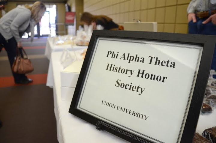 A Phi Alpha Theta sign occupies a prominent place at the Delta-Psi Chapter's Ninth Annual Phi Alpha Theta Franco-American Confection and Bake Sale on March 20, 2013. Photo by Olivia Wallace