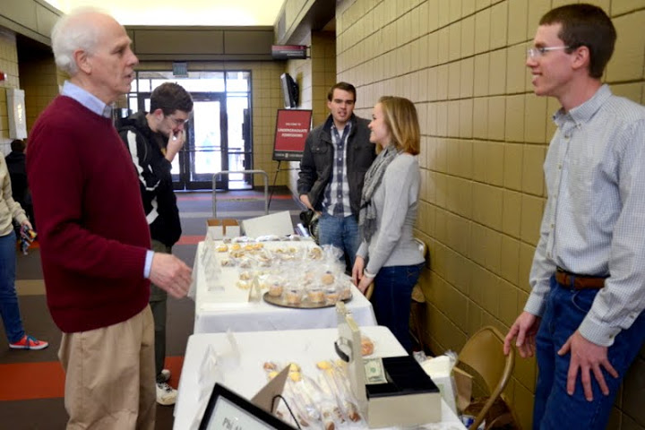 Dr. Stephen Carls (left) talks to Delta-Psi Chapter President Jeffrey Lewoczko (right) during the Phi Alpha Theta bake sale on March 20, 2013. In the background are Phi Alpha Theta members (left to right) Lowell Van Ness, Colton Gebben, and Allie Durham. Photo by Olivia Wallace