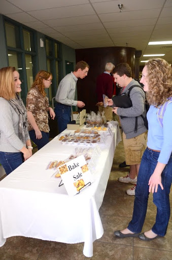 Allie Durham (left to right behind the table), Heather Stricklin, and Jeffrey Lewoczko help customers with their purchases at the Phi Alpha Theta bake sale on March 20, 2013. One of the customers is Union student Hannah King (right foreground). Photo by Olivia Wallace