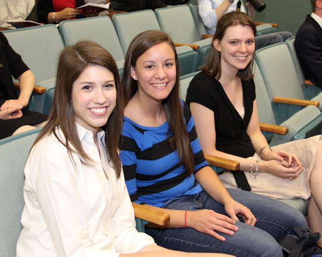 Union students Gracie Wise (left to right) and Rachel Etherington sit with Union librarian Savannah German prior to the start of history major Patricia Dawson's paper presentation at Union University's Scholarship Symposium on Aptril 30, 2013.