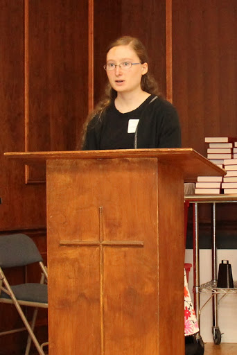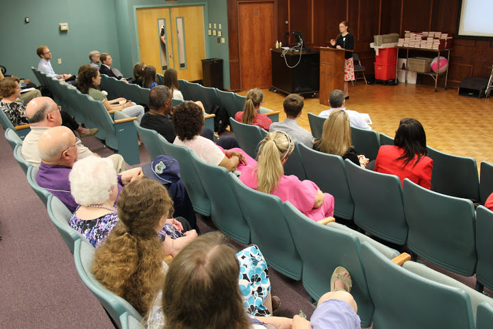 A large audience listens attentively as history major Patricia Dawson presents a paper entitled " The Weapon of Dress: Identity, Acculturation, and the Transition of Cherokee Clothing, 1794-1838" at the Union University Scholarship Symposium on April 30, 2013.